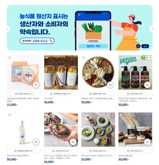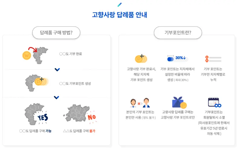 - 답례품: 기부한 금액의 30%에 해당하는 포인트로 지역 특산품을 선택할 수 있습니다.
